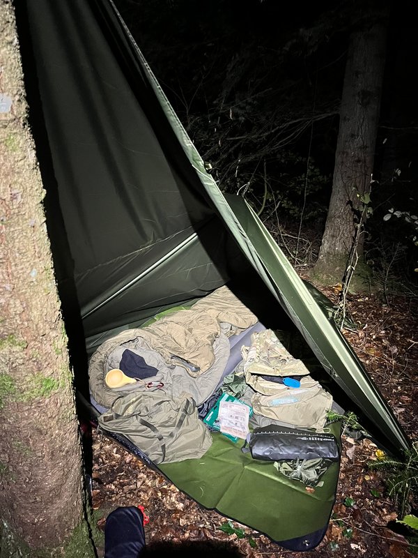 Was ich unterschätzt habe: Die Bodenplane hätte griffbereit sein sollen. Stattdessen musste ich die restliche Ausrüstung kurzzeitig auf dem feuchten Waldboden ablegen – eine unnötige Schlamperei.