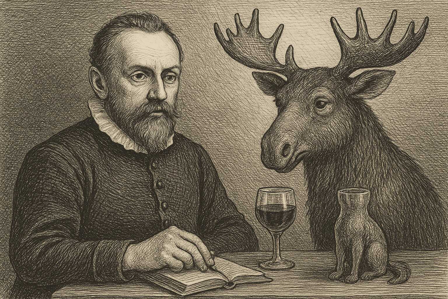 Zum Ausgleich hat das Modell auch einige Inspirationen geliefert. So gibt es eine Geschichte von Tycho Brahe, der einen zahmen Elch besessen haben soll. Dieser Elch sei betrunken die Treppe heruntergestürzt. Deswegen wurde sein Weinglas auch in Form einer Katze generiert. Alles klar? Dann los!